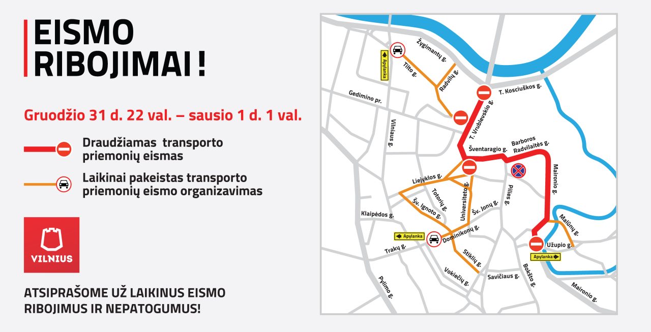 Nuo gruodžio 31 d. 22 val. iki sausio 1 d. 1 val. nakties bus draudžiamas transporto priemonių eismas T. Vrublevskio, Šventaragio, Barboros Radvilaitės gatvėse bei dalyje Maironio gatvės. Dėl to keisis 10, 11, 33, 89 ir 102N autobusų maršrutų trasos bei eismo tvarkaraščiai.