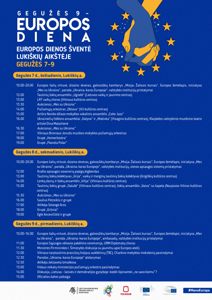 Lukiškių aikštė gegužės 7, 8 ir 9 dienomis bus pilna įdomybių. Geografijos mylėtojai galės pasivaikščioti ant didelio, net 150 kv. m. apimančio Europos žemėlapio ir atrasti jame narystės ES siekiančią Ukrainą, veiks paroda „Ukraina: karas Europoje“, o Europos Parlamento ir Komisijos atstovybės parengtas galvosūkių furgonas suteiks galimybę kiekvienam pasitikrinti savo žinias apie ES klimato politiką. Valstybės institucijos pristatys miestiečiams savo veiklą, o pasieniečiai demonstruos sienos apsaugos sistemos technologijas.