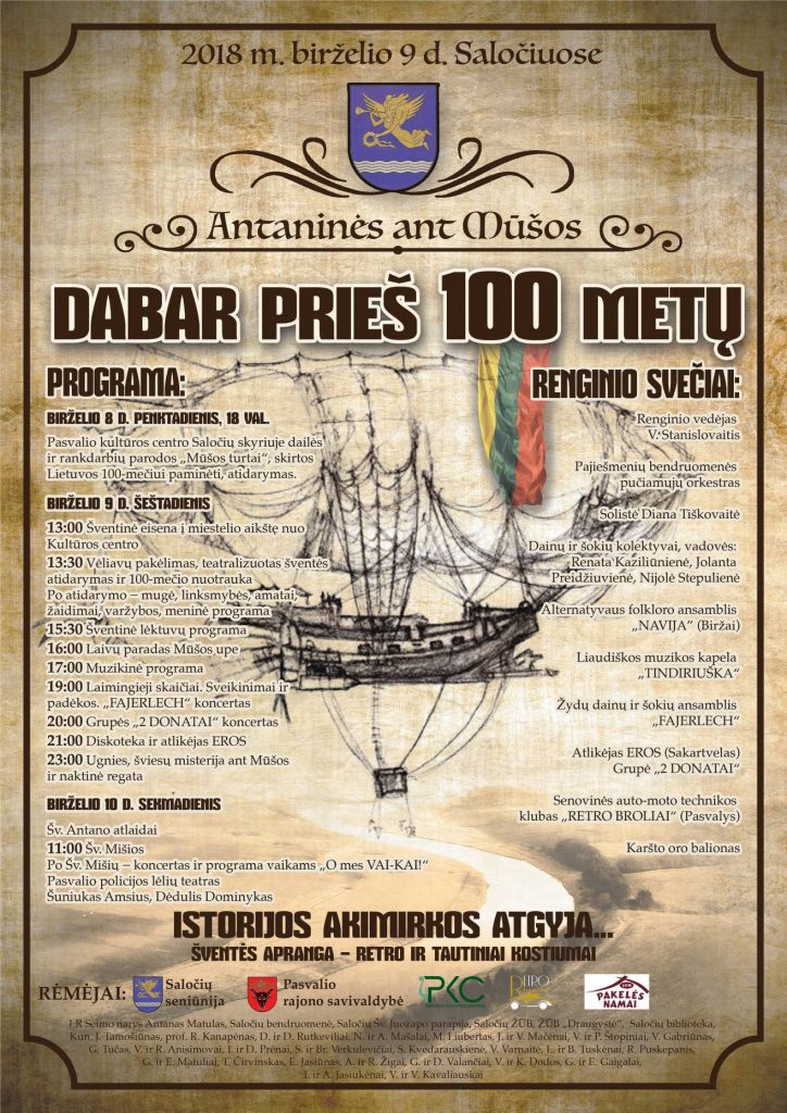 Saločiuose Pasvalio rajone birželio 9 d. šeštadienį nuo 13 val. vyks tradicinė Antaninių šventė „Antaninės ant Mūšos“ – „Dabar prieš 100 metų“.