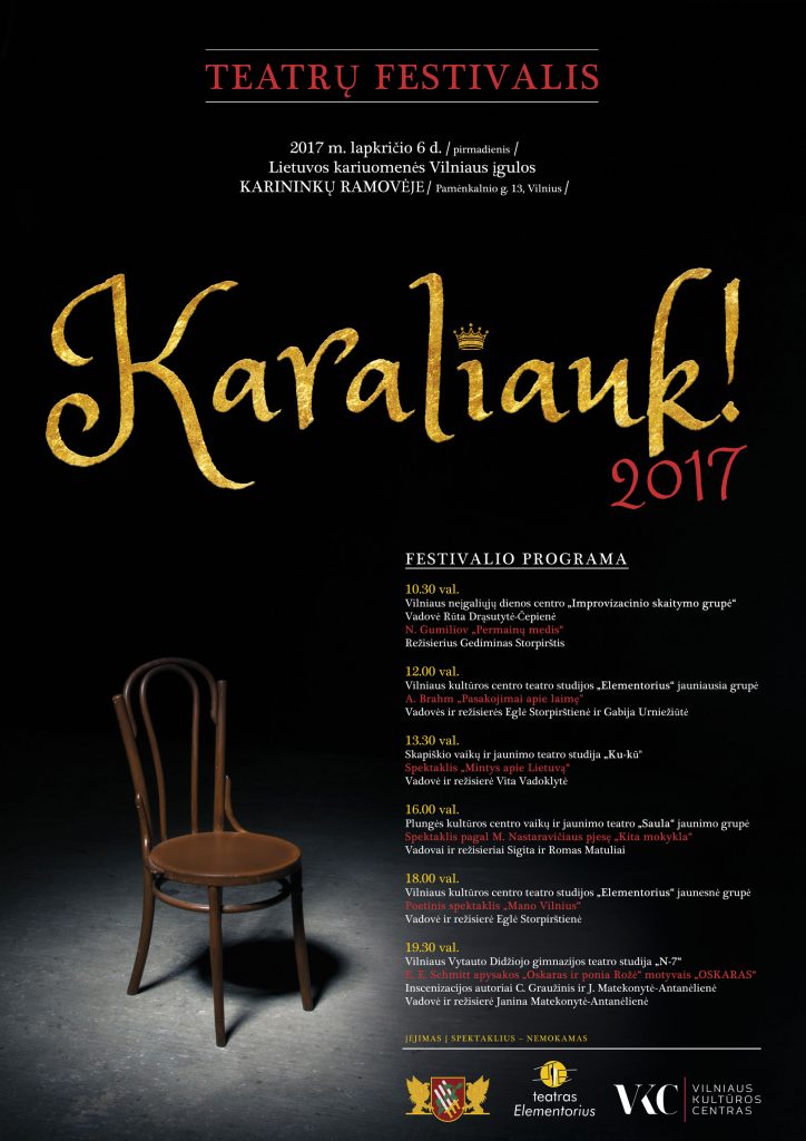 Kviečiame visus mylinčius teatrą į tikrą šventę – jaunatvišką teatrų festivalį „Karaliauk!” 2017 ir tikimės, kad šis festivalis taps gražiu tęstiniu renginiu.