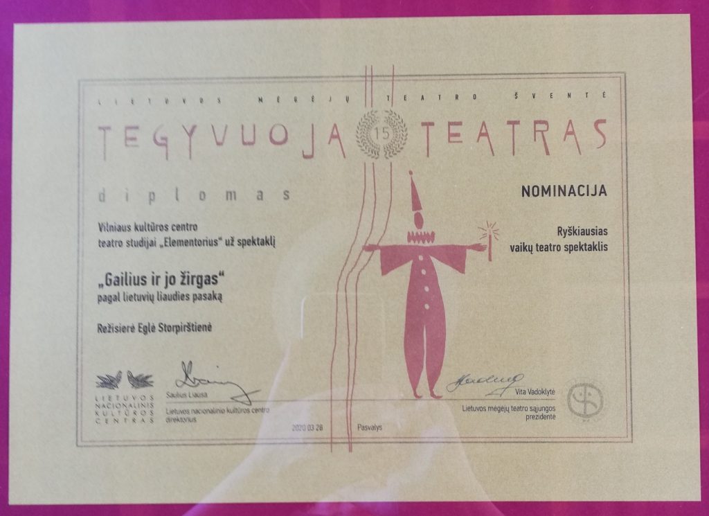 Teatro studijos „Elementorius“ spektaklio „Gailius ir jo žirgas“ kūrybinės komandos nariai tapo ryškiausiu aktorių ansambliu XV-oje Lietuvos mėgėjų teatrų šventėje „Tegyvuoja teatras 2020“