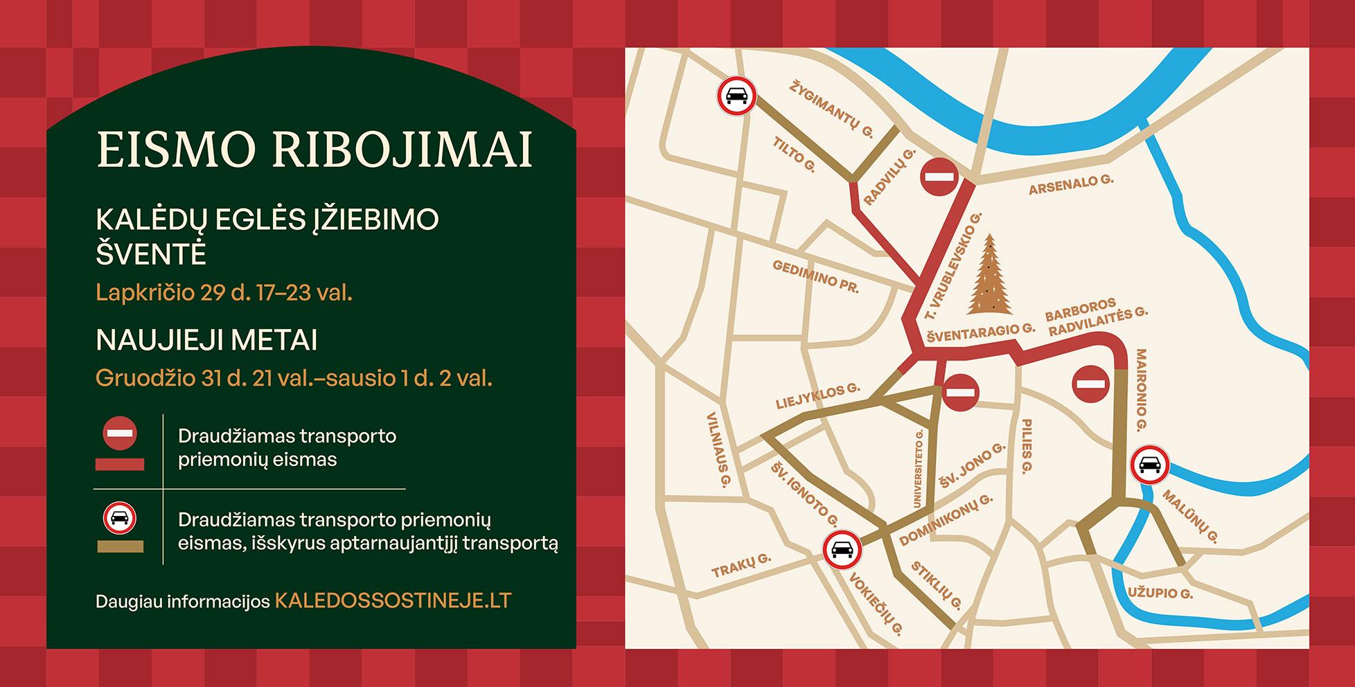Kalėdų eglės įžiebimo šventės metu, lapkričio 29 d. nuo 17 iki 24 val., Katedros aikštės prieigose bus draudžiamas transporto priemonių eismas T. Vrublevskio, Šventaragio, Barboros Radvilaitės gatvėse, draudžiant į jas įvažiuoti iš šalutinių gatvių.
