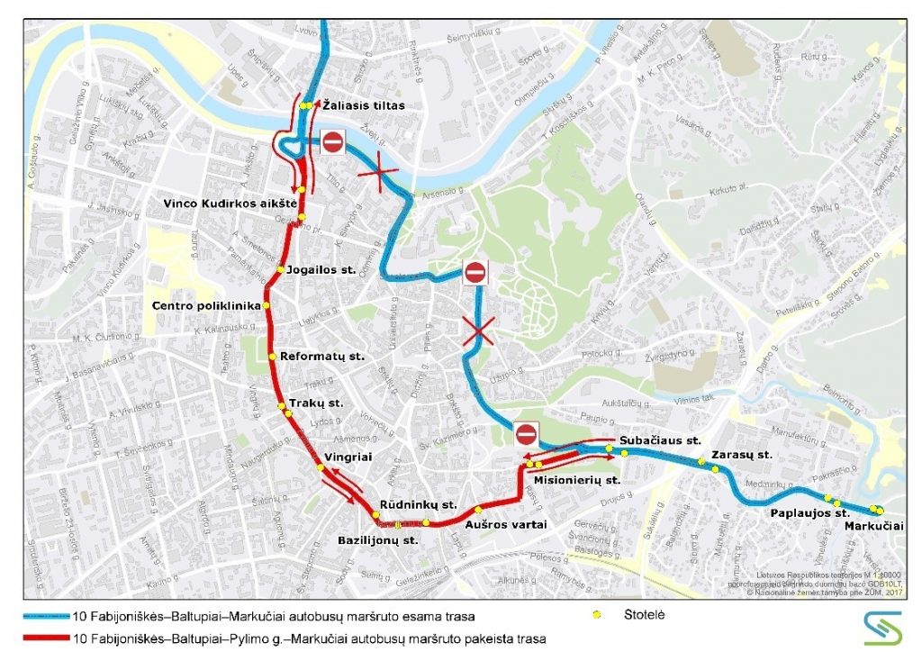 10 maršruto autobusai į Markučius nuo Žaliojo tilto važiuos Vilniaus, Jogailos, Pylimo, Bazilijonų, M. Daukšos, Žiupronių, Subačiaus gatvėmis, toliau – įprasta trasa. Važiuodami pakeista trasa autobusai nestos stotelėse Karaliaus Mindaugo tiltas, Arkikatedra, Bernardinų sodas, Dailės akademijos ir Užupio. Atgal autobusai važiuos tokia pačia trasa. Važiuodami pakeista trasa 10 maršruto autobusai papildomai stos stotelėse Vinco Kudirkos aikštė, Jogailos, Centro poliklinika, Reformatų, Trakų, Vingriai, Rūdninkų, Bazilijonų, Aušros vartai ir Misionierių.