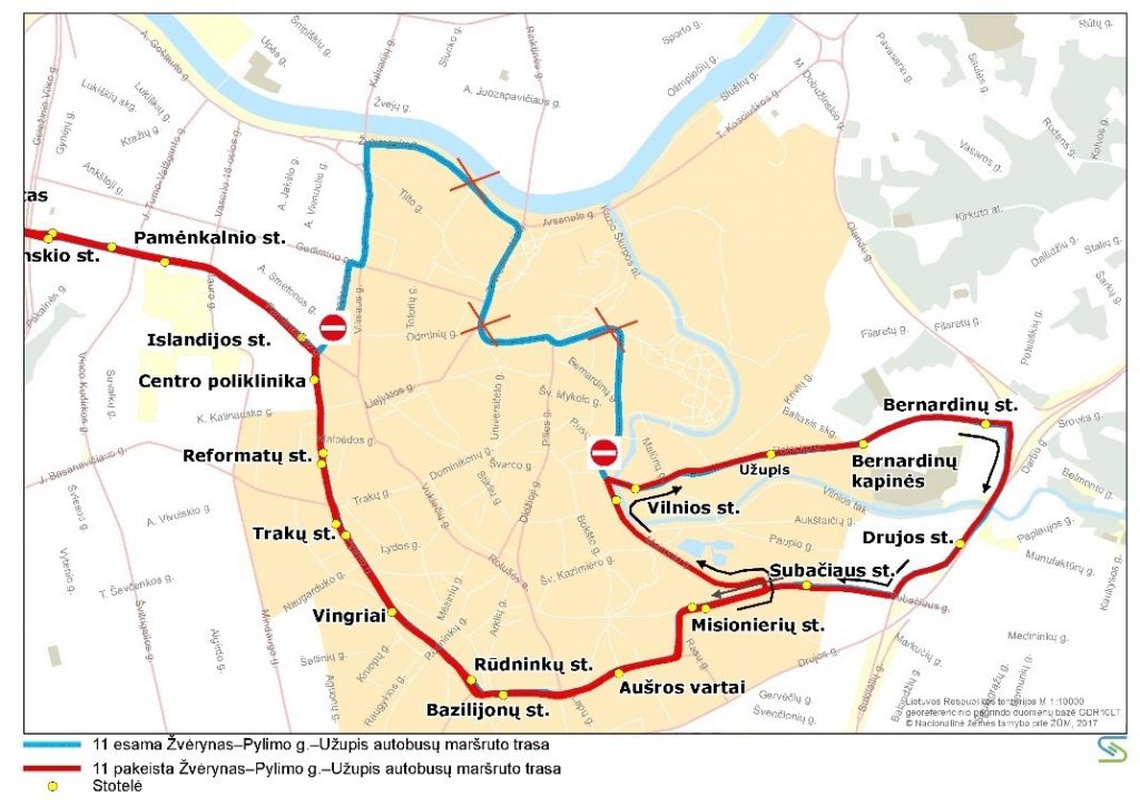 11 maršruto autobusai iš Žvėryno iki Pamėnkalnio–Pylimo–Jogailos gatvių sankryžos važiuos įprasta trasa, toliau suks į Pylimo gatvę ir važiuos Bazilijonų, M. Daukšos, Žiupronių, Subačiaus, Maironio gatvėmis. Iš pastarosios gatvės suks į Užupio gatvę ir važiuos įprasta trasa. Važiuodami pakeista trasa autobusai nestos Jogailos, Vinco Kudirkos aikštė, Karaliaus Mindaugo tiltas, Arkikatedra, Bernardinų sodas bei Dailės akademijos stotelėse. Kursuodami šiuo maršrutu autobusai papildomai stos stotelėse Centro poliklinika, Reformatų, Trakų, Vingriai, Rūdninkų, Bazilijonų, Aušros vartai ir Misionierių. Atgal autobusai grįš įprasta trasa.