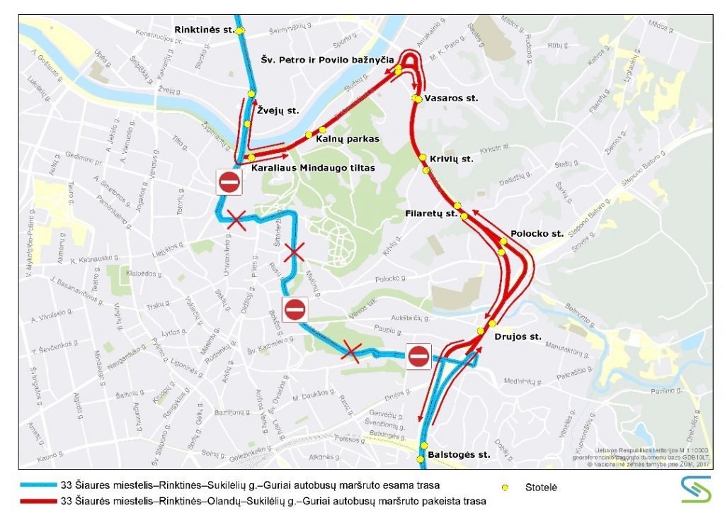 33 maršruto autobusai iš Šiaurės miestelio iki Karaliaus Mindaugo tilto kursuos įprasta trasa, toliau suks į T. Kosciuškos gatvę ir važiuos Olandų bei Drujos gatvėmis, o įsukę į Sukilėlių gatvę grįš į įprastą trasą. Tokia pačia trasa autobusai grįš į Šiaurės miestelį. Pakeitus trasą minėto maršruto autobusai nestos stotelėse Arkikatedra, Bernardinų sodas, Dailės akademija, Užupio ir Subačiaus. Kursuodami šia trasa 33 maršruto autobusai papildomai stos stotelėse Karaliaus Mindaugo tiltas (link Kalnų parko), Kalnų parkas, Šv. Petro ir Povilo bažnyčia, Vasaros, Krivių, Filaretų, Polocko ir Drujos.