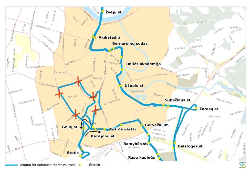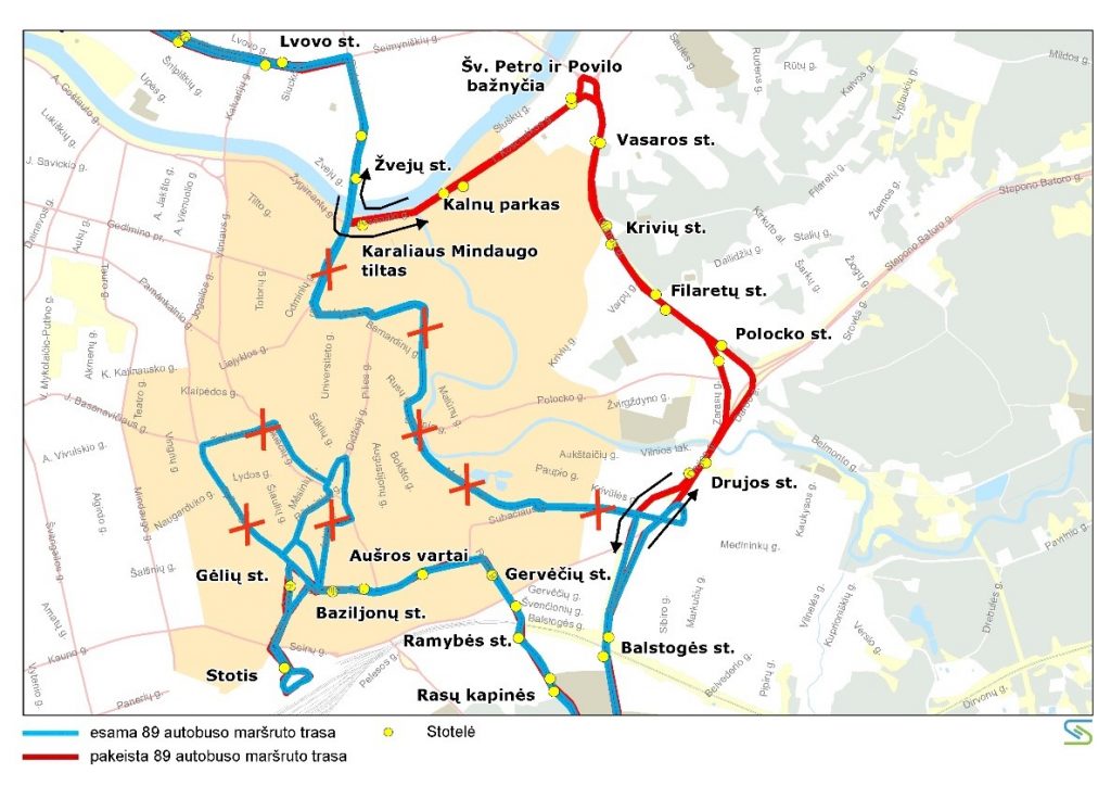 89 maršruto autobusai nuo Nepriklausomybės aikštės iki Karaliaus Mindaugo tilto kursuos įprasta trasa, toliau suks į T. Kosciuškos gatvę ir važiuos Olandų bei Drujos gatvėmis, o įsukę į Sukilėlių gatvę grįš į įprastą trasą. Tokia pačia trasa autobusai važiuos ir atgal. Pakeitus trasą minėto maršruto autobusai nestos stotelėse Arkikatedra, Bernardinų sodas, Dailės akademija, Užupio ir Subačiaus. Kursuodami šia trasa 89 maršruto autobusai papildomai stos stotelėse Karaliaus Mindaugo tiltas (link Kalnų parko), Kalnų parkas, Šv. Petro ir Povilo bažnyčia, Vasaros, Krivių, Filaretų, Polocko ir Drujos.