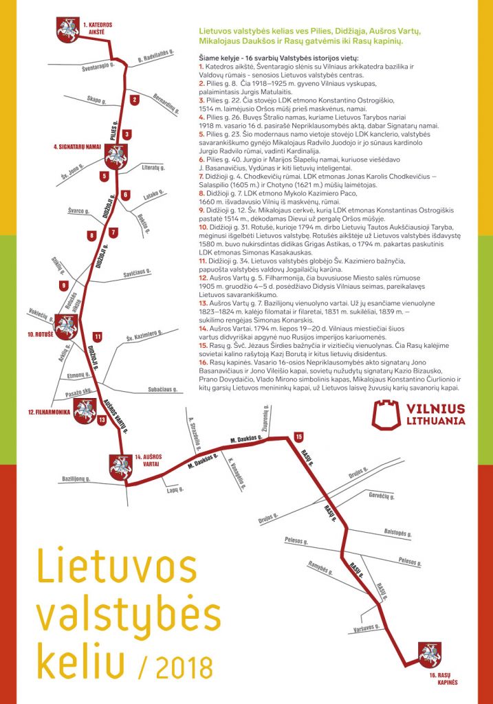 Vasario 16-osios jaunimo eisena „Lietuvos valstybės kelias“ – mus su Lietuvos valstybe ir jos kūrėjais jungiantis simbolinis kelias, kuris nusidrieks pro 16 svarbių Valstybės istorijoje vietų. Prasidėjęs senajame Lietuvos valstybės centre – Šventaragio slėnyje, prie Valdovų rūmų ir Katedros, kurioje ilsisi Vytautas ir kiti didieji kunigaikščiai, Valstybės kelias ves Pilies gatve pro Signatarų namus, Didžiąja gatve pro Didžiojo Vilniaus seimo rūmus, pro Aušros Vartus, Mikalojaus Daukšos gatve į Rasų kapines, prie daktaro Jono Basanavičiaus kapo, už Tėvynės laisvę žuvusių savanorių kapų: